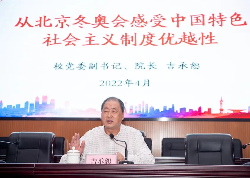 吉承恕指出,从“奥运三问”到“双奥之城”,折射出一个民族从站起来、富起来到强起来的壮阔历程。冬奥梦交汇中国梦,体育强则中国强,冬奥会的成功举办具有重大意义。他讲解了北京冬奥会的筹办理念,我国筹办冬奥会的成功密码,围绕冬奥会申办、筹办、举办的过程,解读“胸怀大局、自信开放、迎难而上、追求卓越、共创未来”的北京冬奥精神,深入剖析了中国特色社会主义制度的优越性。他号召新时代青年大学生,要弘扬北京冬奥精神,用实际行动回应党和人民的殷切期望,将青春融入家国,用奋斗成就幸福。