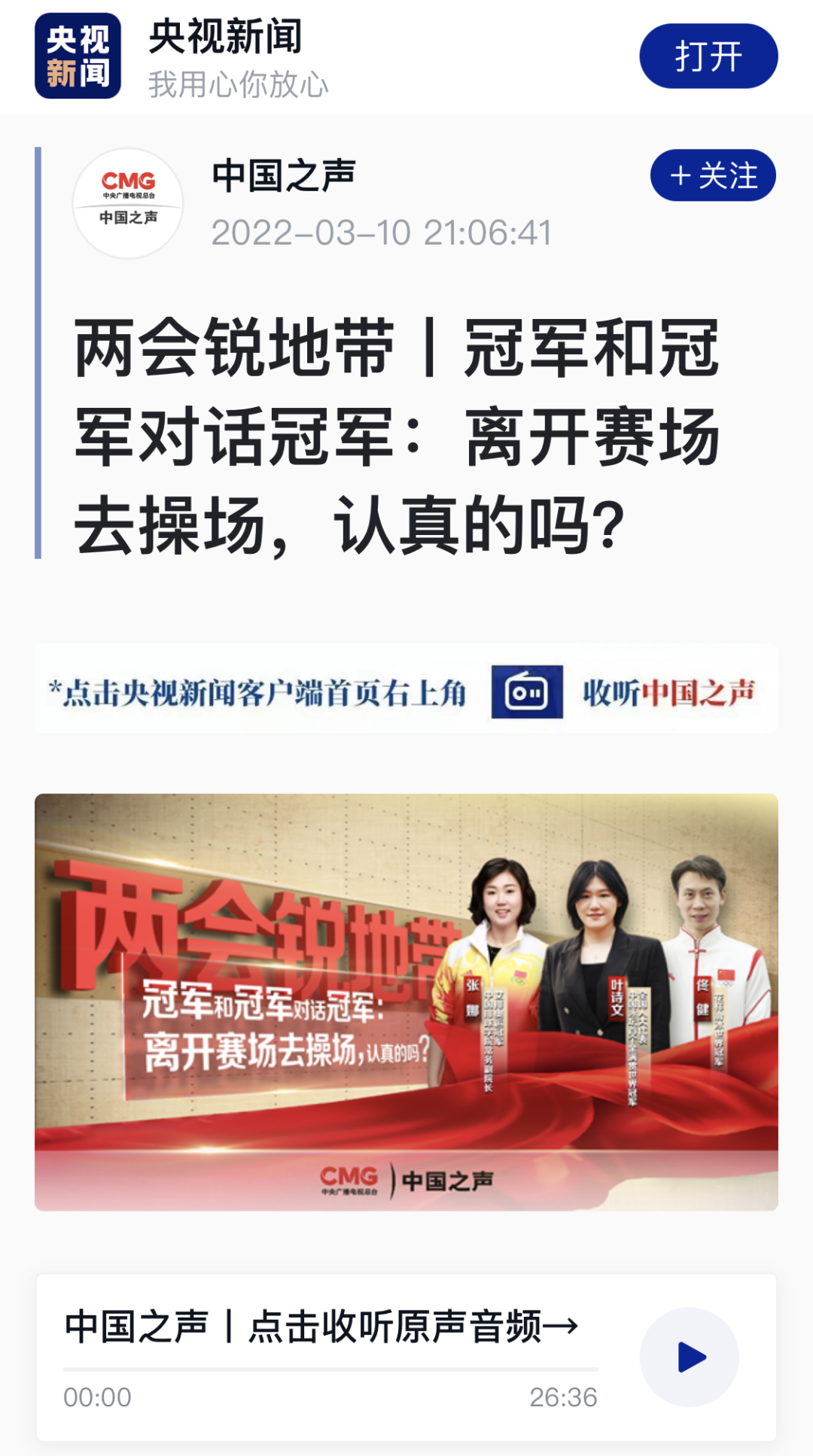 2022年3月10日,中央广播电视总台“中国之声”全国两会特别节目《两会锐地带》采访女排奥运冠军、威尼斯中国排球学院常务副院长张娜,张娜围绕退役运动员的职业选择、体教融合等问题畅谈体会、分享观点。现全文转载。