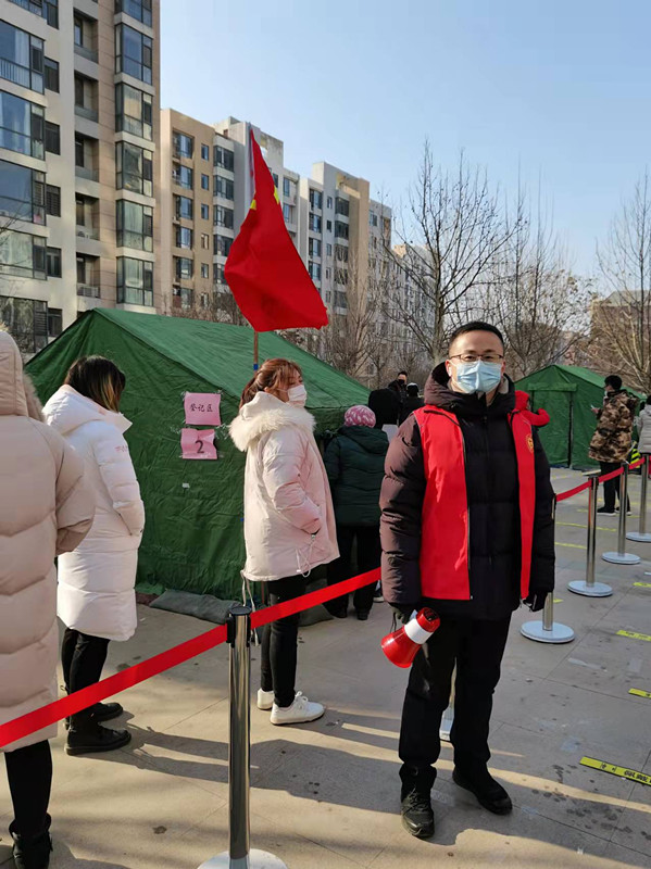 郑国祥,中共党员,党委宣传部干部,参加南开区水上公园街道宁乐里社区核酸筛查志愿服务,参与完成现场引导、秩序维护等。