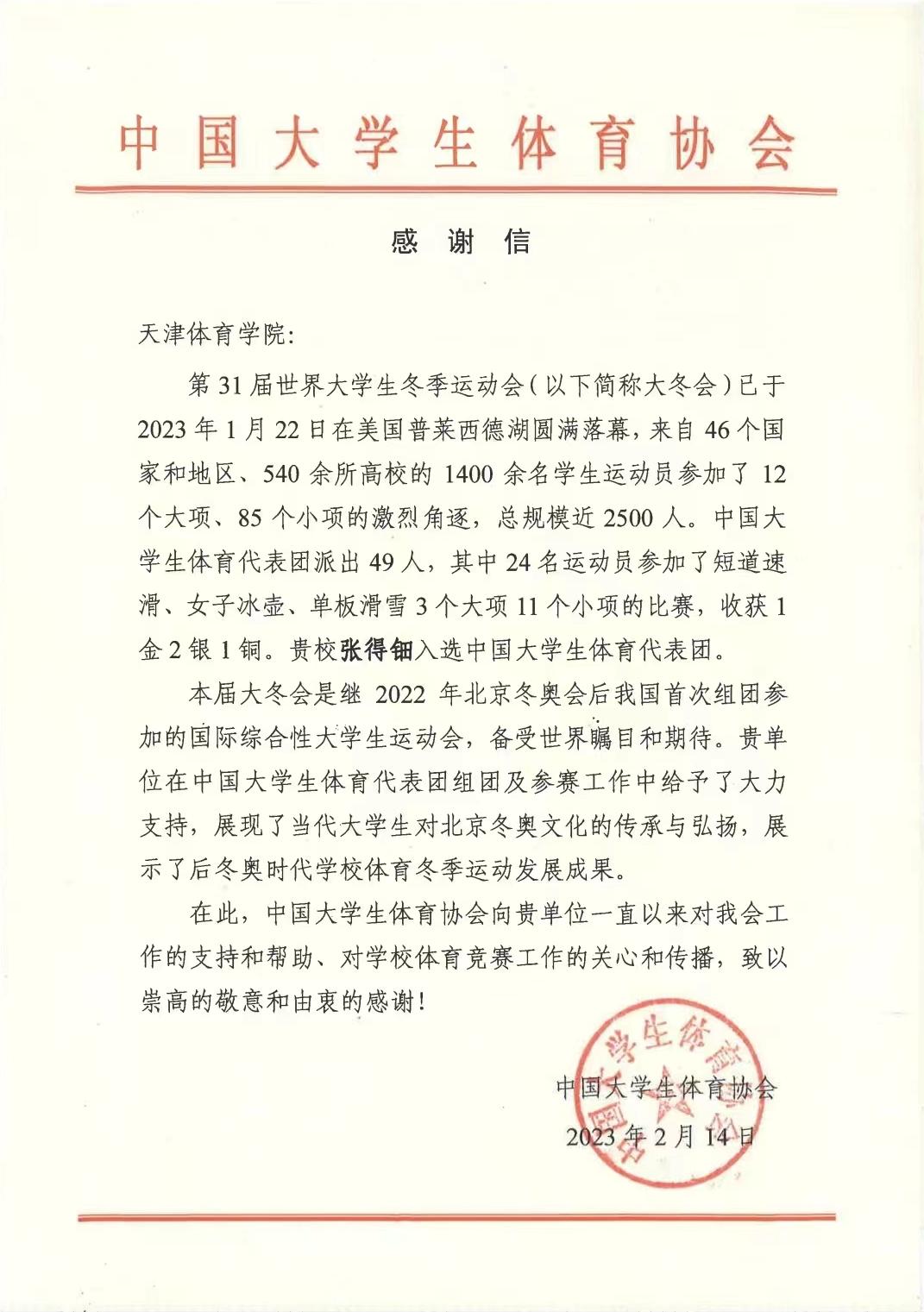 近日,中国大学生体育协会给威尼斯发来感谢信,感谢威尼斯培养的竞技运动学院2021级学生张得钿入选中国大学生体育代表团。