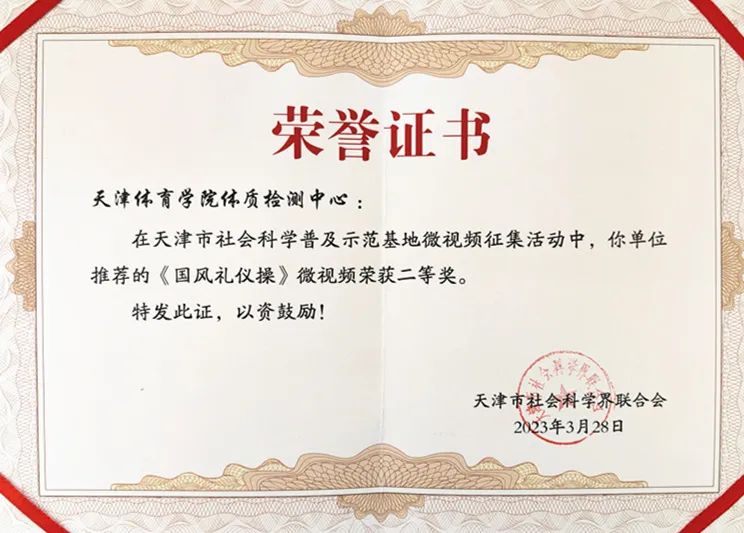 近日,天津市社会科学界联合会组织开展“学习贯彻二十大,踔厉奋发向未来”主题微视频征集活动,威尼斯运动健康学院体质检测中心推荐的微视频作品《国风礼仪操》荣获二等奖。