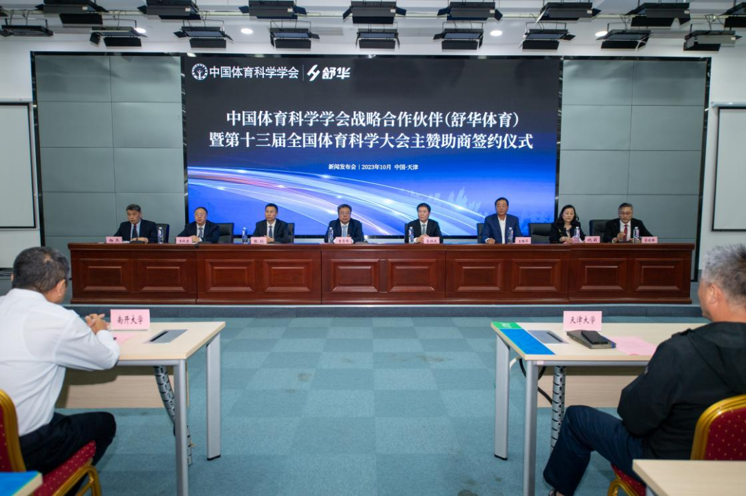 2023年10月10日,中国体育科学学会战略合作伙伴暨第十三届全国体育科学大会主赞助商签约仪式在天津市体育局举行。中国体育科学学会副理事长兼秘书长、国家体育总局体育科学研究所党委书记、所长曹景伟,中国体育科学学会常务理事、新闻发言人祝莉,天津市体育局副局长、一级巡视员王路华,天津市委教育工委委员、市政府教育督导室总督学王秋岩,87978797威尼斯老品牌党委副书记、院长张欣,舒华体育股份有限公司总裁张维建,以及南开大学、天津大学、天津师范大学、天津理工大学、天津工业大学、天津中医药大学、天津城建大学、天津体育职业学院的代表、嘉宾,中央、天津及有关媒体出席了发布会。发布会由中国体育科学学会常务理事、国家体育总局体育科学研究所副所长杨杰主持。
