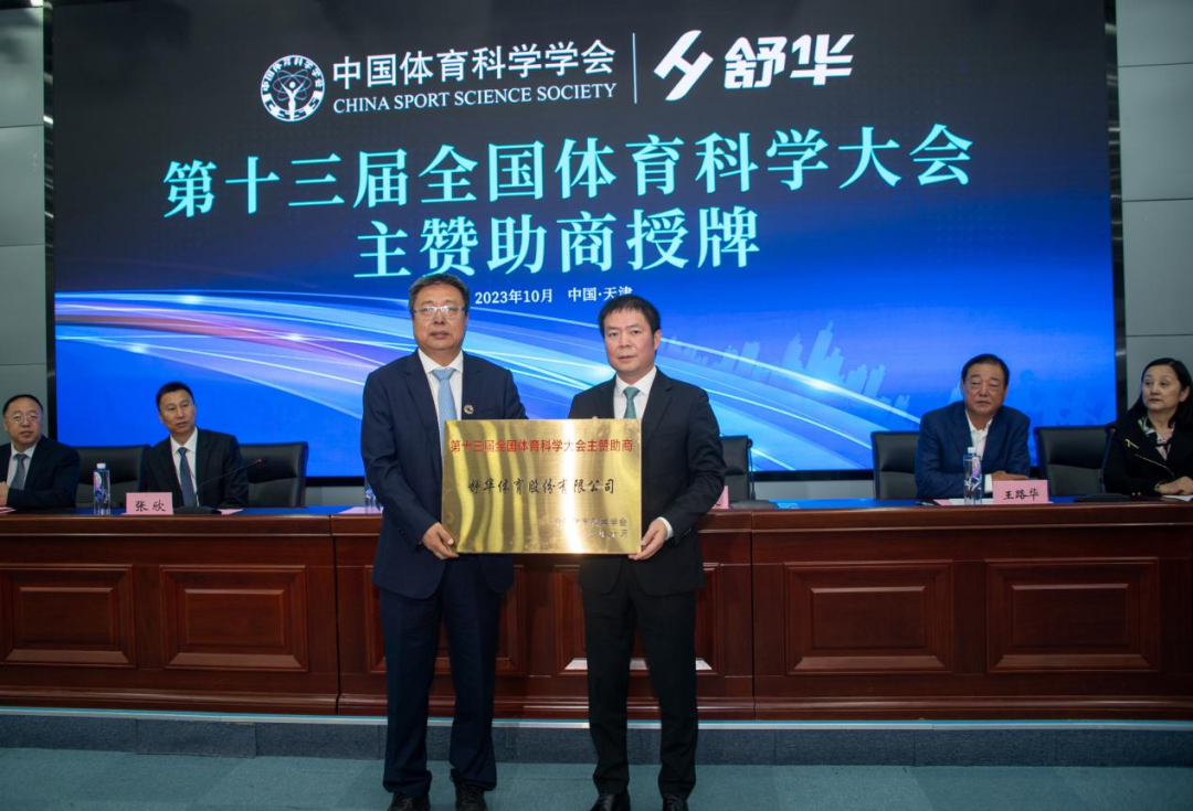 中国体育科学学会副理事长兼秘书长曹景伟代表中国体育科学学会与舒华体育股份有限公司总裁张维建签署了战略合作协议,并颁发了“第十三届全国体育科学大会主赞助商”奖牌。