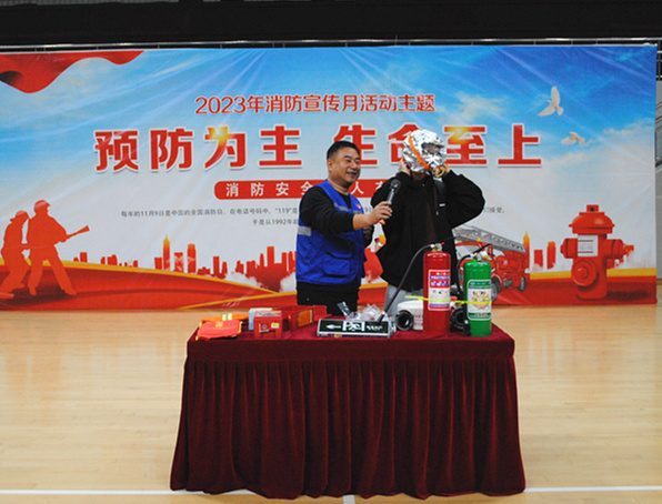 消防知识讲座环节,工作人员为师生讲解了火灾预防、火场报警、疏散逃生等消防安全知识,演示了灭火器、消防水带、灭火毯、呼吸面罩等消防器材的使用方法,并邀请师生代表进行了实操演练。