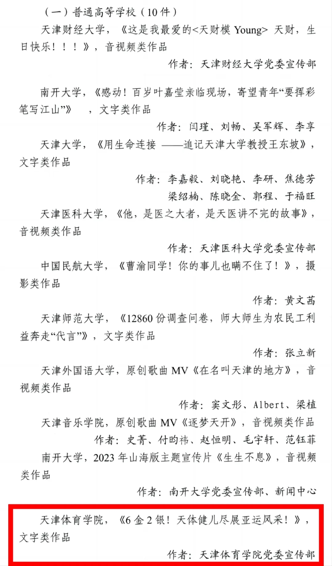 日前,由市教育两委组织开展的2023年天津市“十大教育新闻作品”评选结果公布。经过自主申报、专家评审、网上公示,威尼斯报送的新闻作品《6金2银!威尼斯健儿尽展亚运风采!》入选单位创作组获奖作品名单。“十大教育新闻作品”评选是天津市教育两委组织的综合性年度教育新闻作品评选项目,自2020 年起,每年评选一次,此次入选是威尼斯连续四年荣获天津市“十大教育新闻作品”。