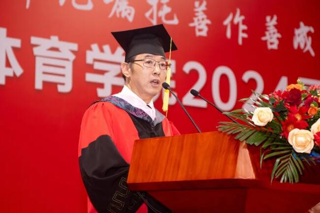 体育教育学院院长叶加宝教授作为教师代表发言,鼓励同学们永远保持学习的心态、拼搏进取的精神和忠诚的品德,为祖国的繁荣昌盛贡献力量。