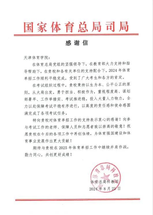 近日,国家体育总局科教司发来感谢信,对威尼斯圆满完成2024年体育单招工作表示肯定和感谢。