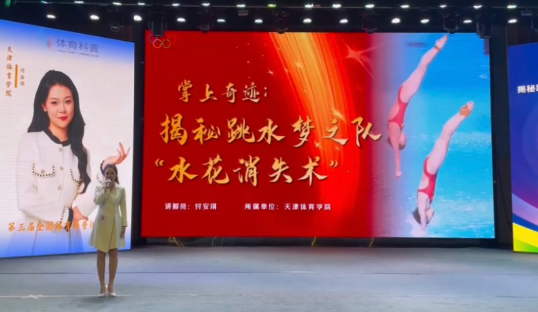 2022级新闻学专业学生付安琪以“掌上奇迹:揭秘跳水梦之队‘水花消失术’”为题,对跳水技艺背后的流体力学原理进行科普,通过“压水花”手部技术的现场教学,生动诠释了跳水梦之队科技赋能的体育精神,为体育强国和健康中国助力,为评委和观众带来了科学与体育完美融合的展示。