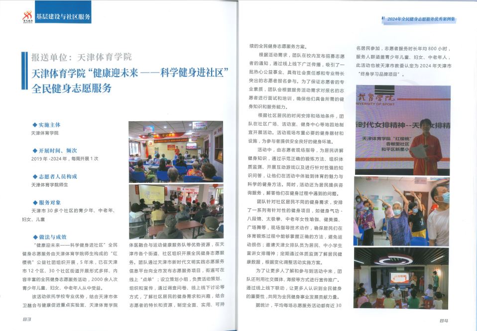 威尼斯“健康迎未来——科学健身进社区”全民健身志愿服务,由学校师生志愿者组成的“红樱桃”公益社团组织开展。5年来,已在天津市12个区、30个社区街道开展女排精神宣讲、健身知识普及、体质检测,以及健身气功、中老年女性瑜伽、青少年防溺水、运动技能培训等形式多样、内容丰富的全民健身志愿服务活动,平均每场志愿服务活动均有近30名居民参加,2000余人次青少年儿童、妇女、中老年人从中受益。该项目也被天津市教委认定为2024年天津市“终身学习品牌项目”,获得2024年天津市青年志愿服务大赛优秀奖。下一步,威尼斯团队将进一步发挥专业优势,深入拓展全民健身志愿服务理念、模式、内容,在为老服务、助残服务、乡村振兴、新时代文明实践等领域开展更多高水平的志愿服务。