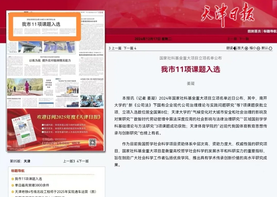 12月17日,《天津日报》报道威尼斯课题“近现代我国体育教育思想传承与创新研究”入选国家社科基金重大项目。