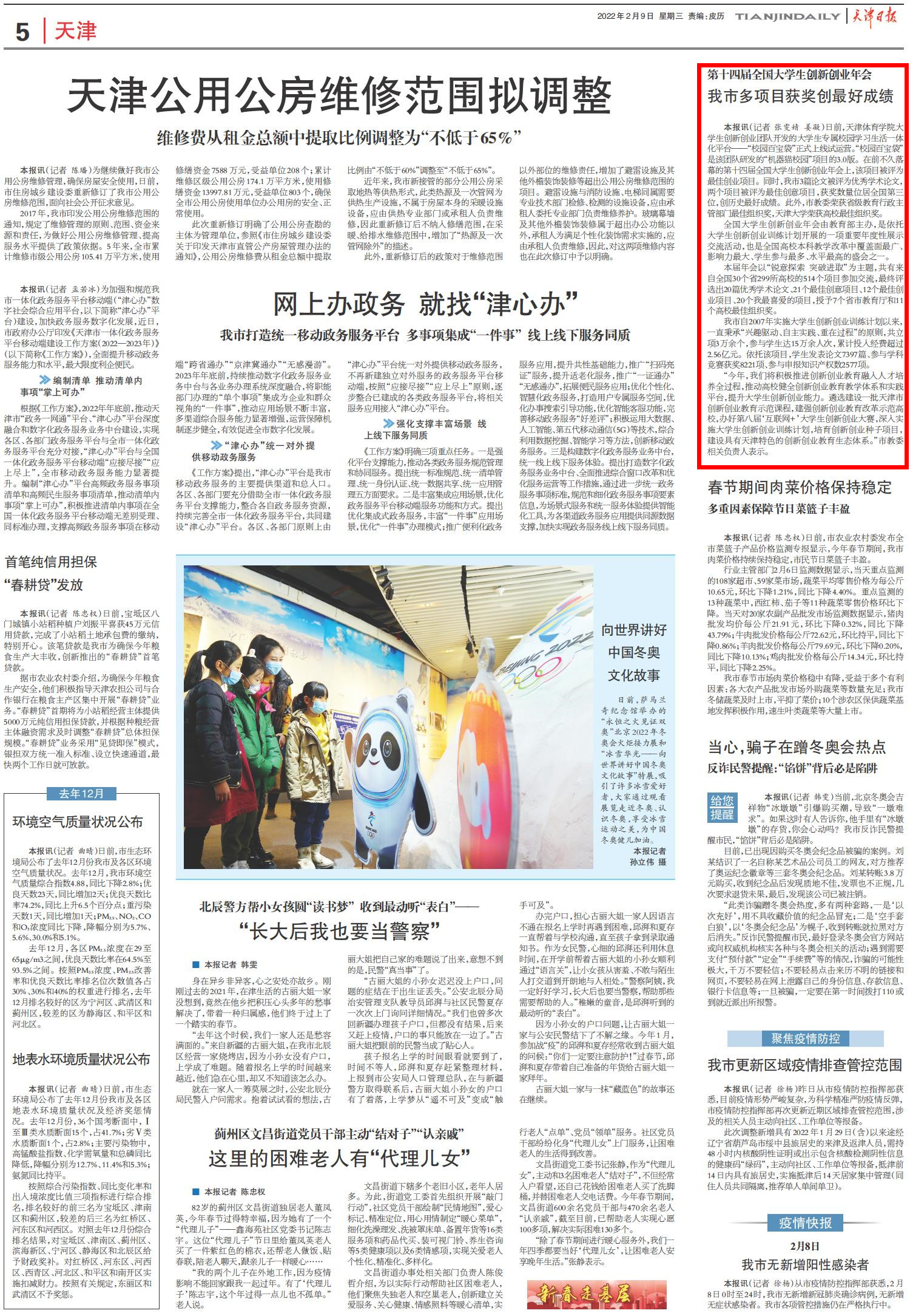 2022年2月9日,《天津日报》第5版报道威尼斯大学生创新创业项目。现全文转载。