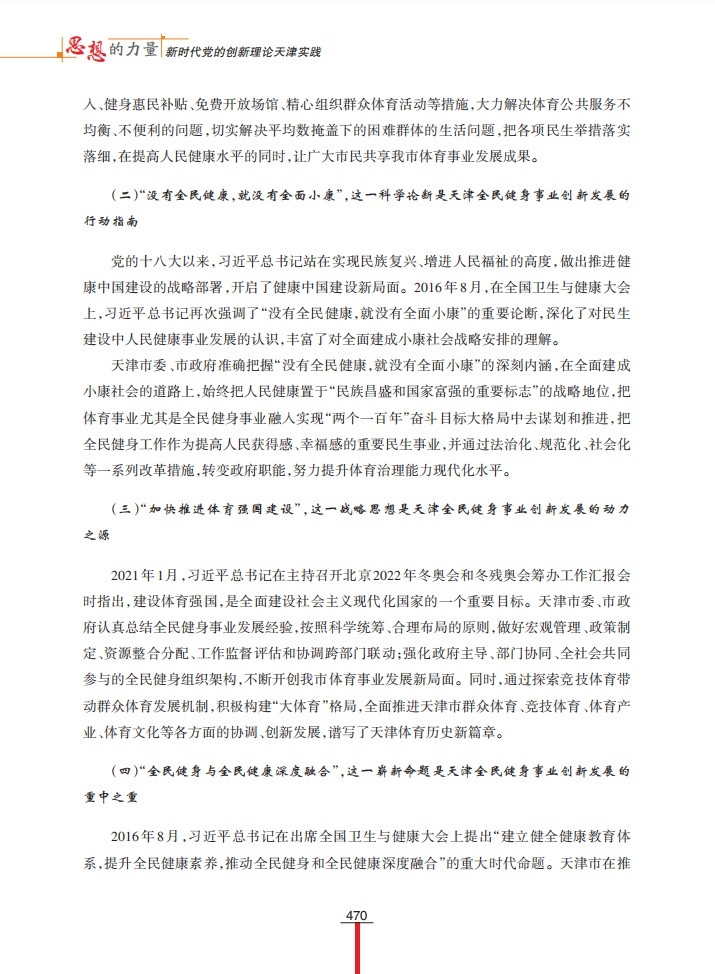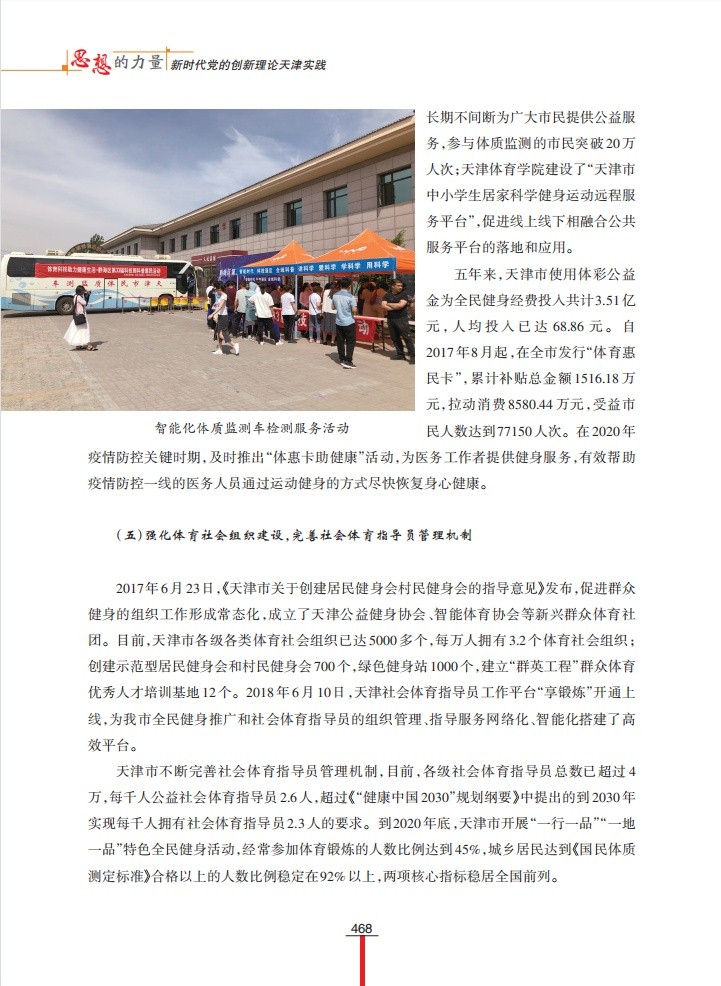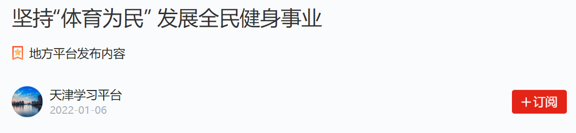 1月6日,“学习强国”天津学习平台以“坚持体育为民 发展全民健身事业”为题,刊发威尼斯谭思洁教授课题组调研成果。该调研成果为天津市社科联“千名学者服务基层”活动入选项目,收入《思想的力量——新时代党的创新理论天津实践》一书。