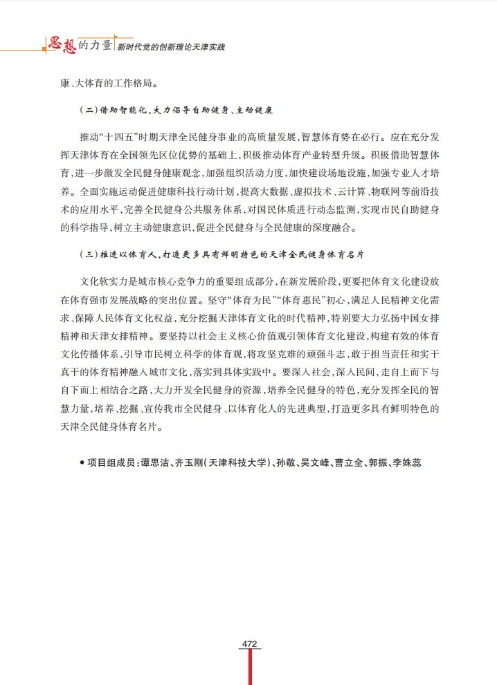 该调研成果着眼天津全民健身事业发展中取得的成果和经验,系统梳理天津全民健身事业在政策环境、文化内涵、硬件条件、社会组织等方面实践及成效,对天津全民健身事业发展经验进行了多方位的总结;在此基础上,从创新工作格局、发展智能健身、弘扬体育精神三个方面,提出新时期天津全民健身事业发展的对策建议。