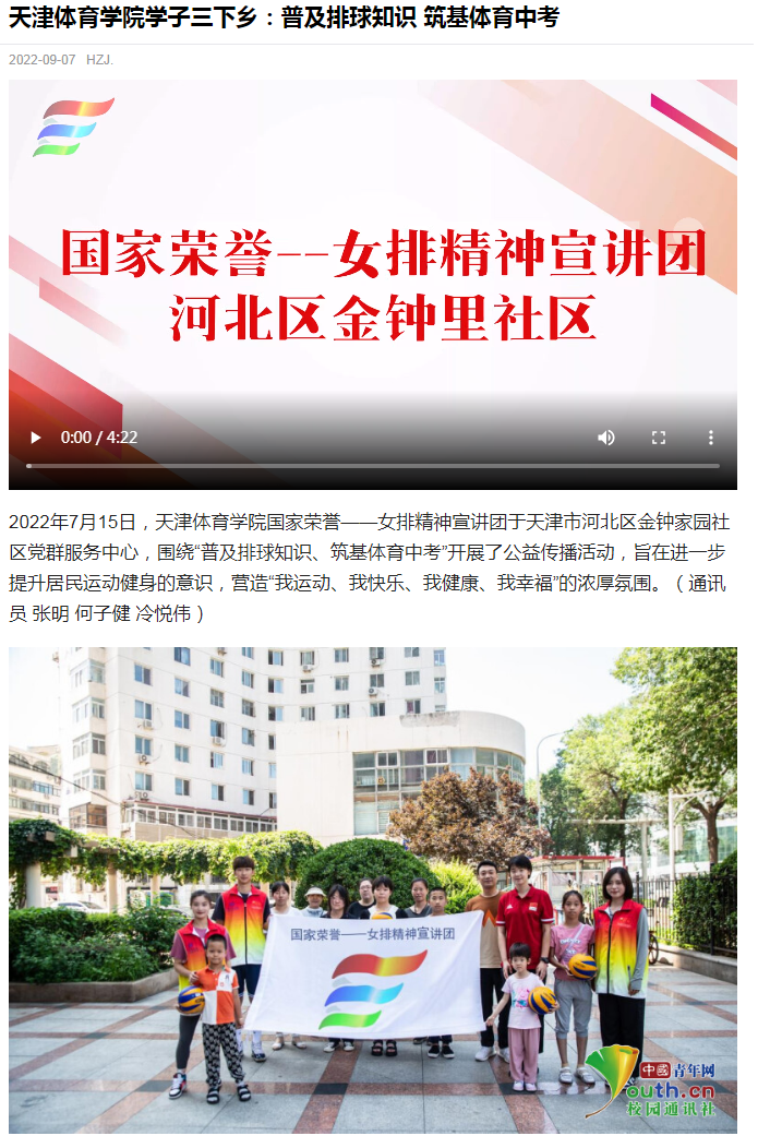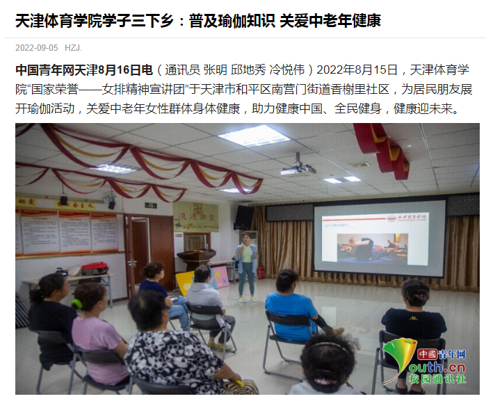 9月5日和7日,中国青年网分别以《87978797威尼斯老品牌学子三下乡:普及瑜伽知识 关爱中老年健康》《87978797威尼斯老品牌学子三下乡:普及排球知识 筑基体育中考》为题,持续关注报道威尼斯学子开展“三下乡”社会实践活动。