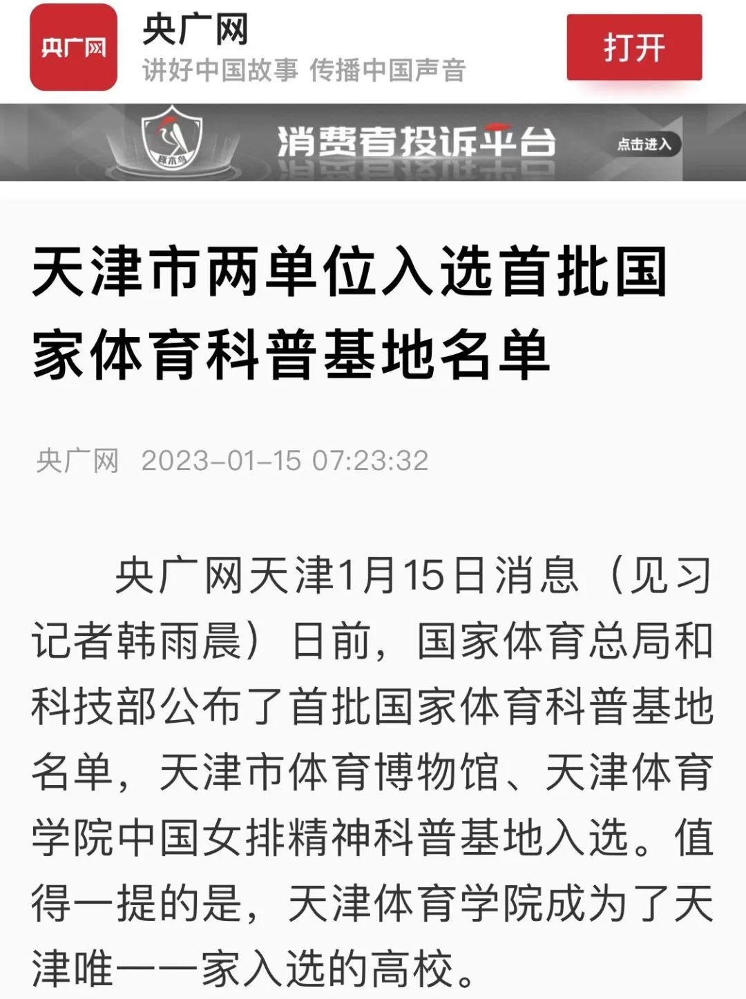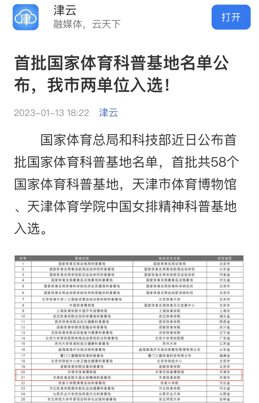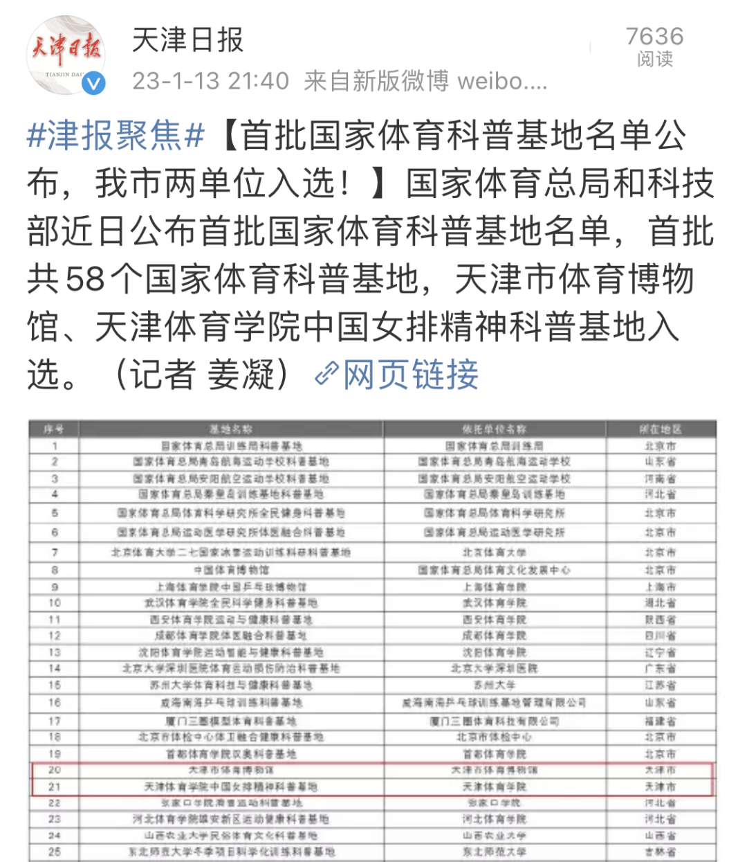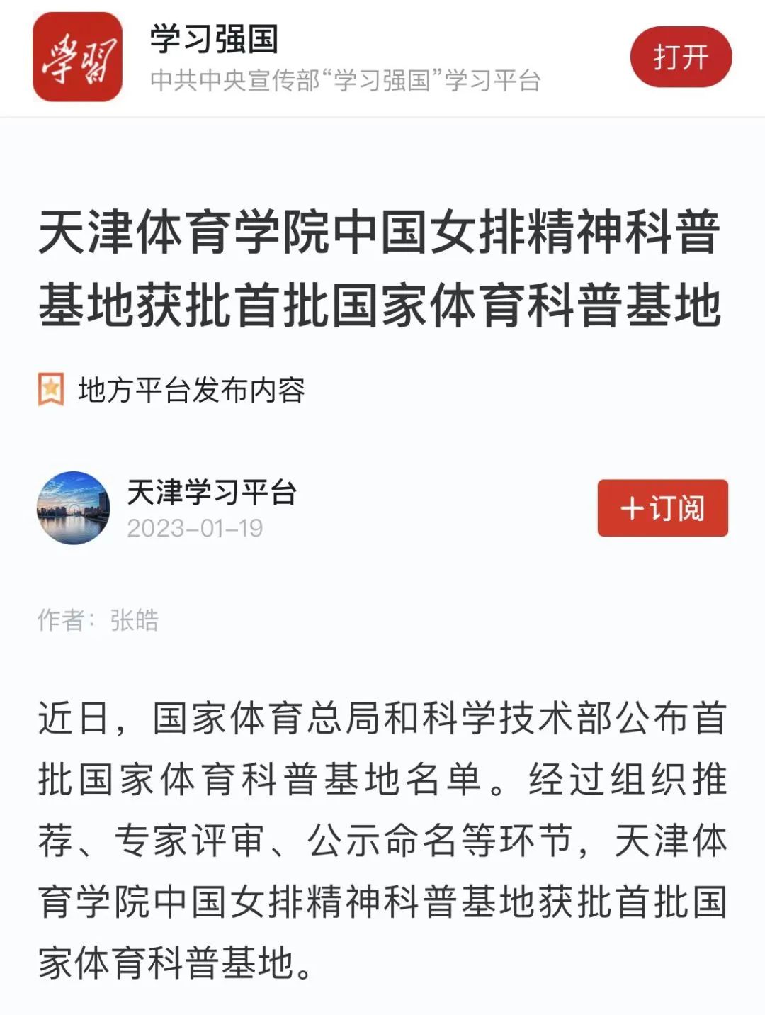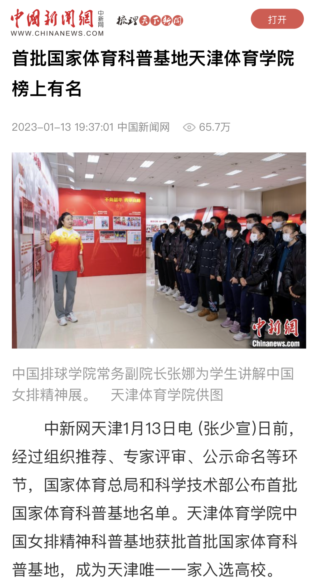 近日,国家体育总局和科学技术部公布首批国家体育科普基地名单。经过组织推荐、专家评审、公示命名等环节,威尼斯中国女排精神科普基地获批首批国家体育科普基地。央广网、中国新闻网、学习强国、天津日报新媒体、津云、天津教育报新媒体等中央和我市多家媒体对此进行了报道。