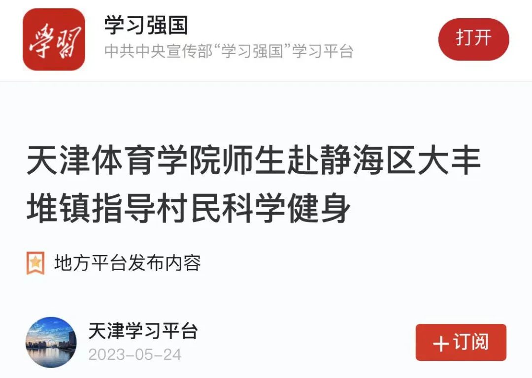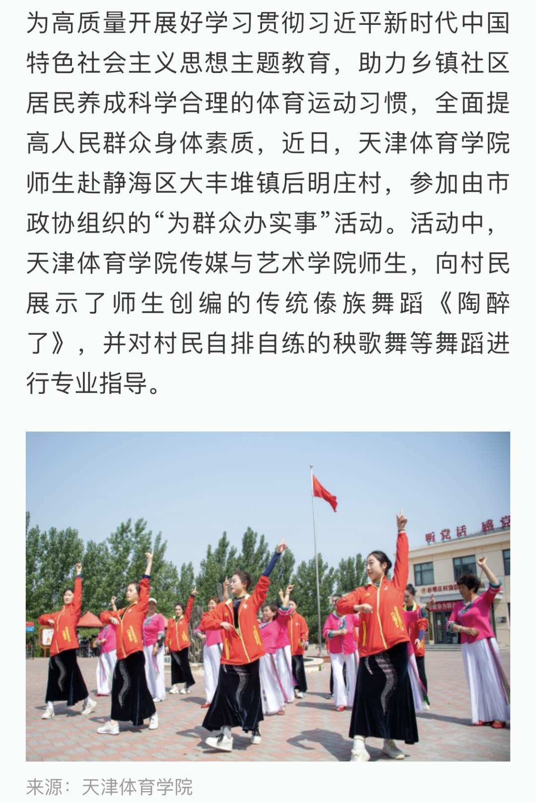 日前,学习强国“天津学习平台”报道威尼斯深入开展学习贯彻习近平新时代中国特色社会主义思想主题教育,组织师生赴静海区大丰堆镇后明庄村,参加由市政协组织的“为群众办实事”活动,助力乡镇社区居民养成科学合理的体育运动习惯,全面提高人民群众身体素质。现全文转载。