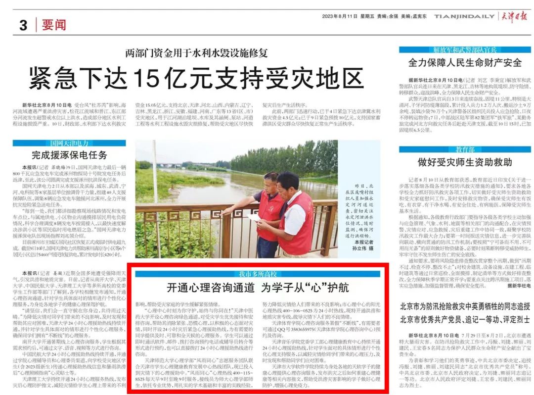 近期全国多地遭受强降雨天气,引发洪涝和地质灾害。日前,《天津日报》报道威尼斯开通心理咨询通道,为身处各地学子的健康心理保驾护航。