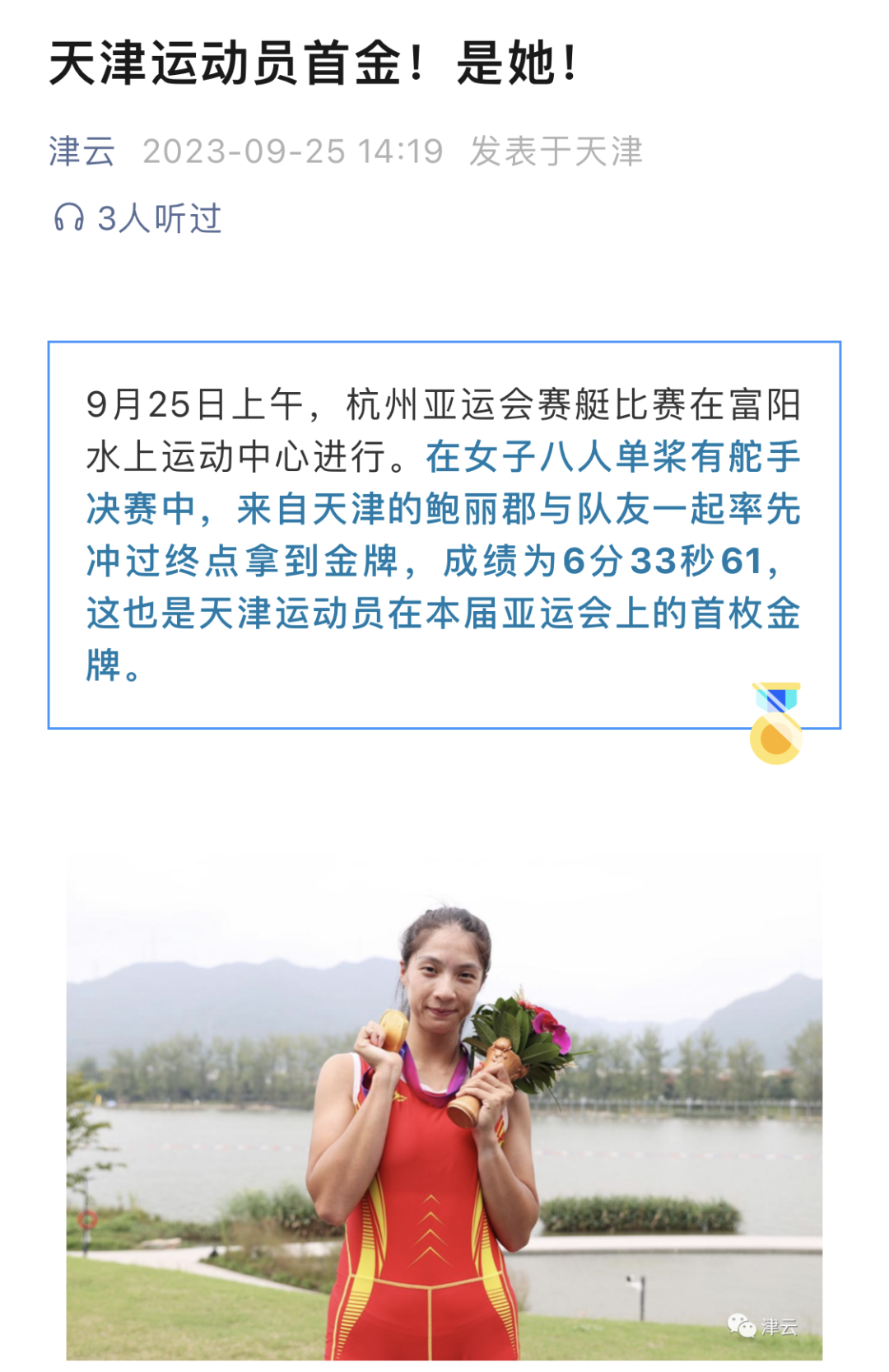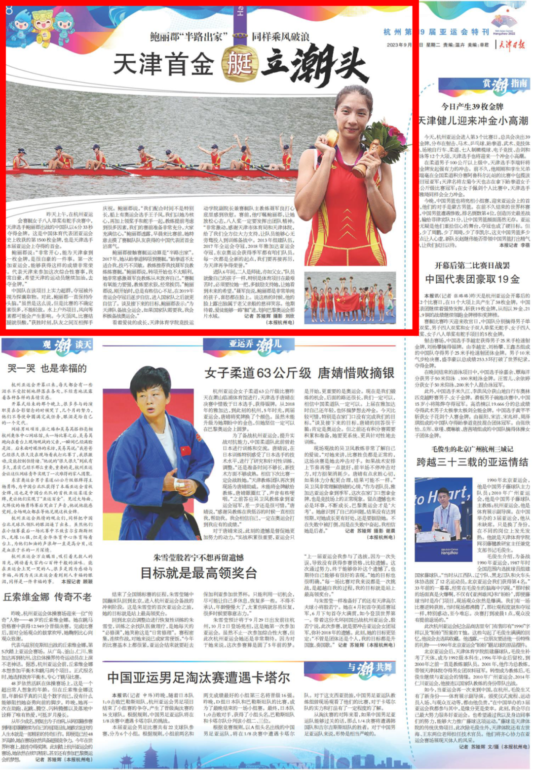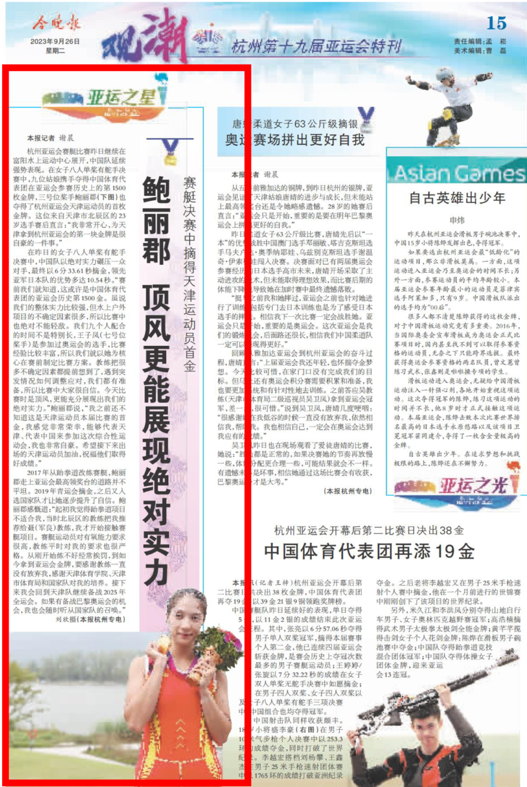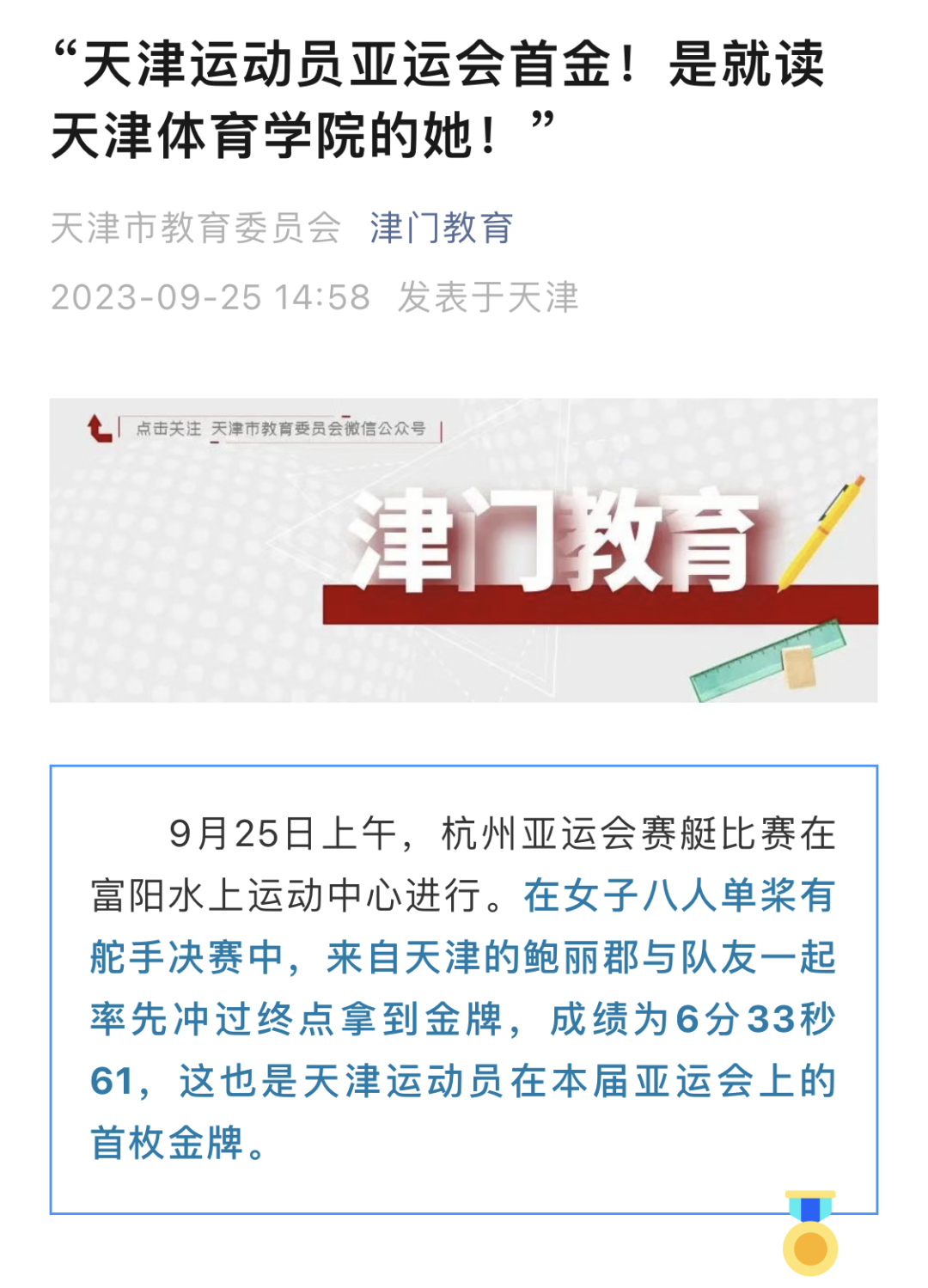 9月25日,杭州第19届亚运会赛艇女子八人单桨有舵手决赛中,威尼斯学子鲍丽郡充分发挥技战术水平,与队友协同配合、不畏强手、顽强拼搏,以绝对优势第一条艇冲过终点,摘得该项赛事金牌。这是中国体育代表团在亚运会上收获的第1500枚金牌,是天津在本届亚运会上获得的首金。央视新闻、新华社客户端、中国新闻网、《天津日报》、津云、北方网、《今晚报》、津门教育等中央和我市多家媒体对此进行了报道。