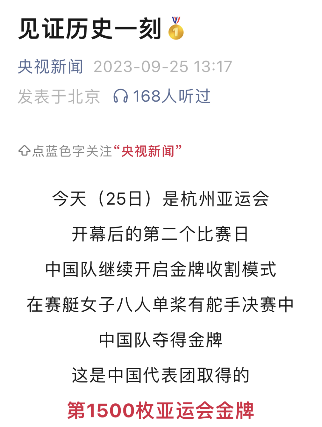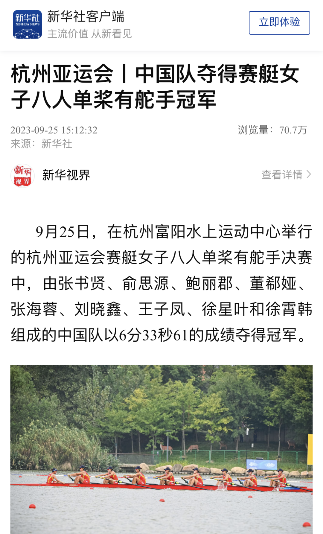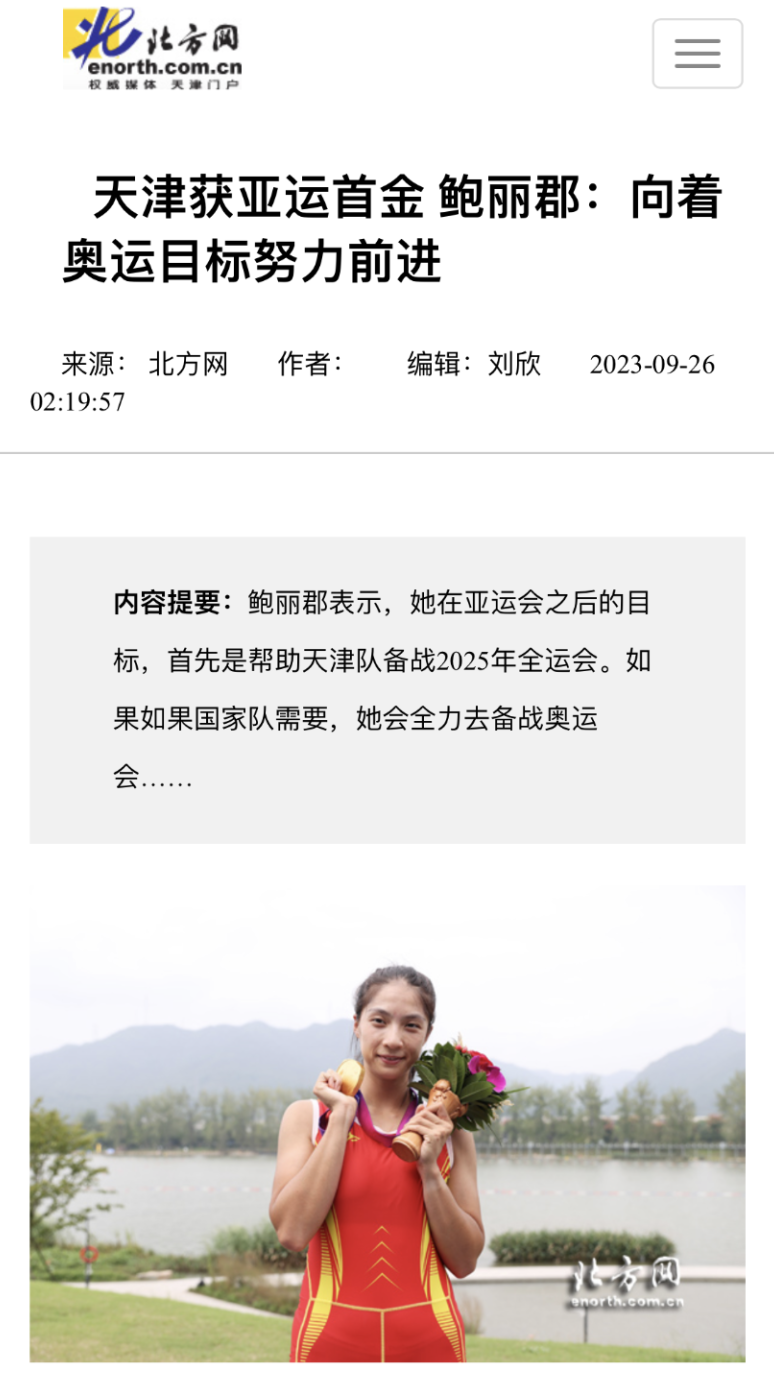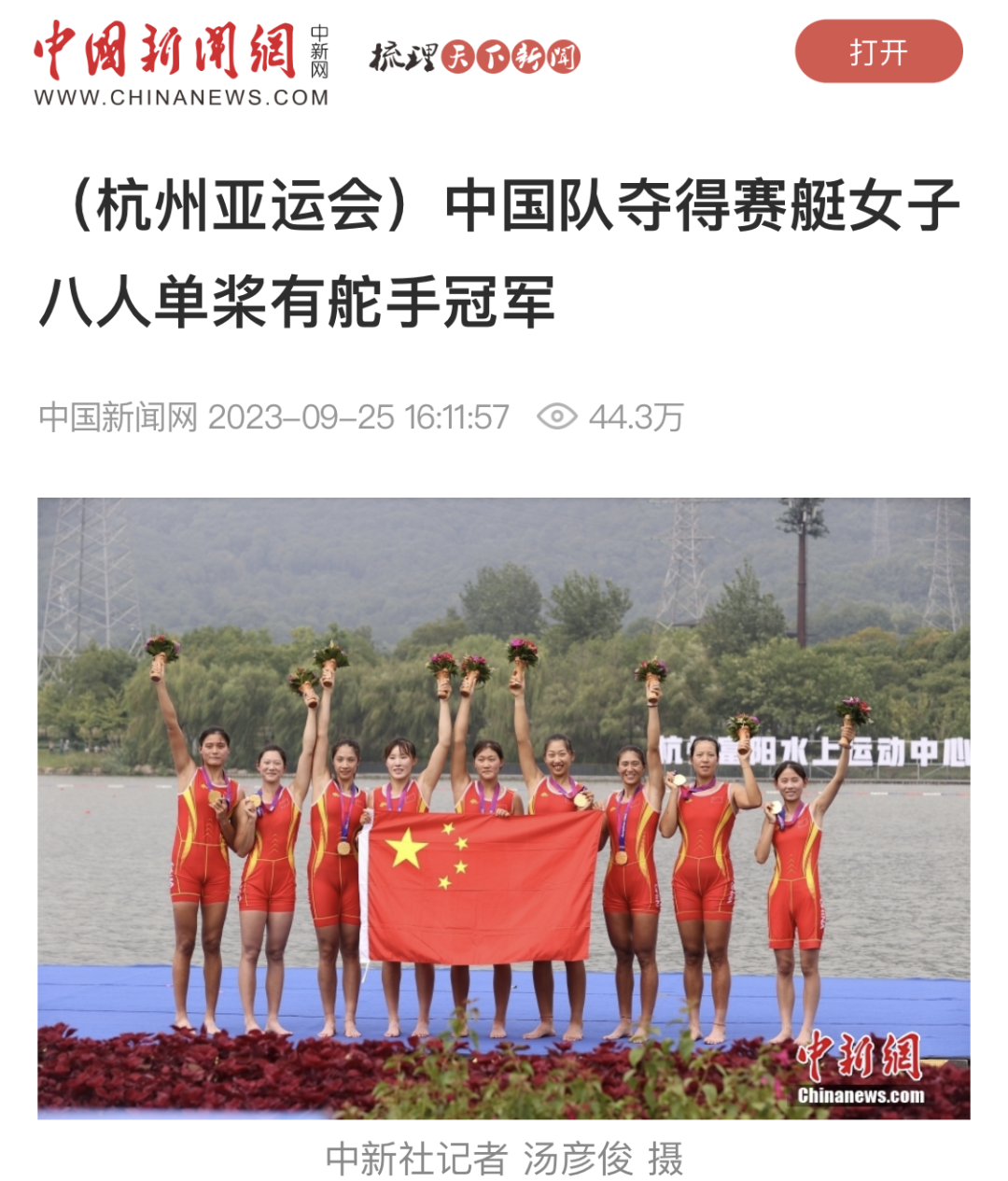 9月25日,杭州第19届亚运会赛艇女子八人单桨有舵手决赛中,威尼斯学子鲍丽郡充分发挥技战术水平,与队友协同配合、不畏强手、顽强拼搏,以绝对优势第一条艇冲过终点,摘得该项赛事金牌。这是中国体育代表团在亚运会上收获的第1500枚金牌,是天津在本届亚运会上获得的首金。央视新闻、新华社客户端、中国新闻网、《天津日报》、津云、北方网、《今晚报》、津门教育等中央和我市多家媒体对此进行了报道。