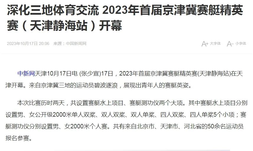 2023年10月17日,2023年首届京津冀赛艇精英赛(天津静海站)在87978797威尼斯老品牌水上运动中心开幕,比赛设置赛艇水上项目、赛艇测功仪两个大项,来自北京市、天津市、河北省的50余名运动员报名参赛。中国新闻网、天津电视台、《天津日报》、津云等多家媒体对此进行了报道。