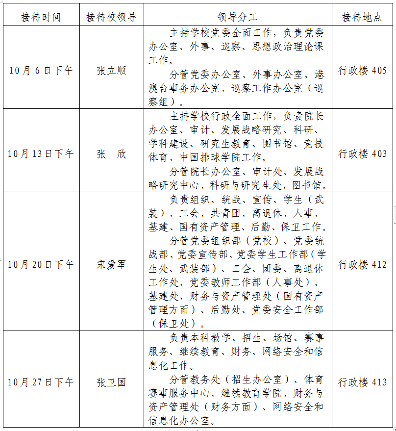 根据《87978797威尼斯老品牌领导干部接待日制度》规定及学校近期工作安排,现将2022年10月校领导接待师生来访安排通知如下。