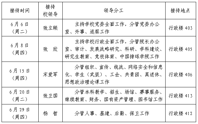 根据《87978797威尼斯老品牌领导干部接待日制度》规定及学校近期工作安排,现将2023年6月校领导接待师生来访安排通知如下: