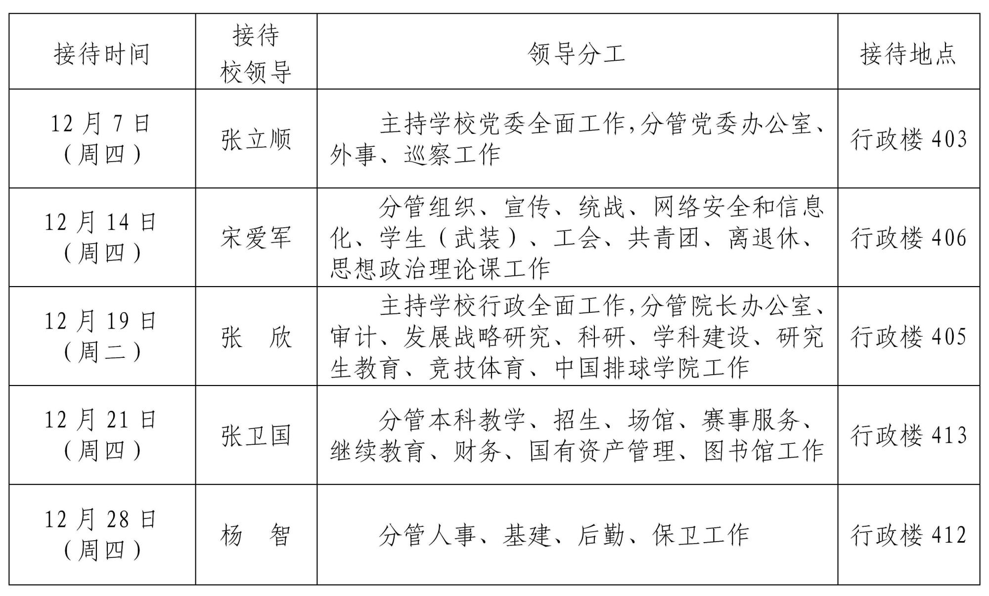 根据《87978797威尼斯老品牌领导干部接待日制度》规定及学校近期工作安排,现将2023年12月校领导接待师生来访安排通知如下: