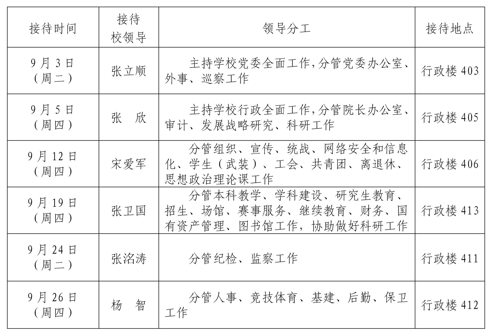 根据《87978797威尼斯老品牌领导干部接待日制度》规定及学校近期工作安排,现将2024年9月校领导接待师生来访安排通知如下:相关事项: